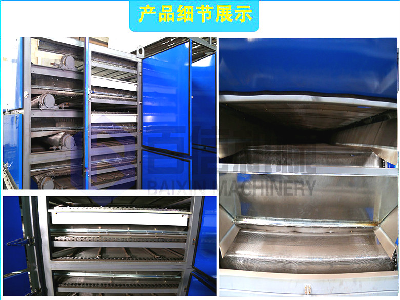 百信機械生產(chǎn)的大型網(wǎng)帶式辣椒烘干機是非標(biāo)機,都是可以根據(jù)客戶的生產(chǎn)需求來定制的。常規(guī)型號有:6米、7米、8米、9米、10米、11米、12米、15米等。網(wǎng)帶層數(shù)4-6層可定制加工,滿足了不同用戶的需求。